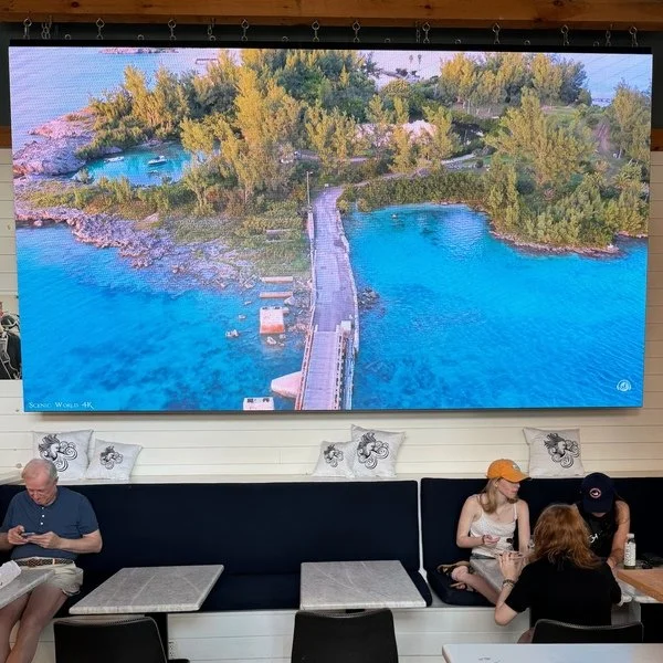 The giant movie screen projects constant seaside videos