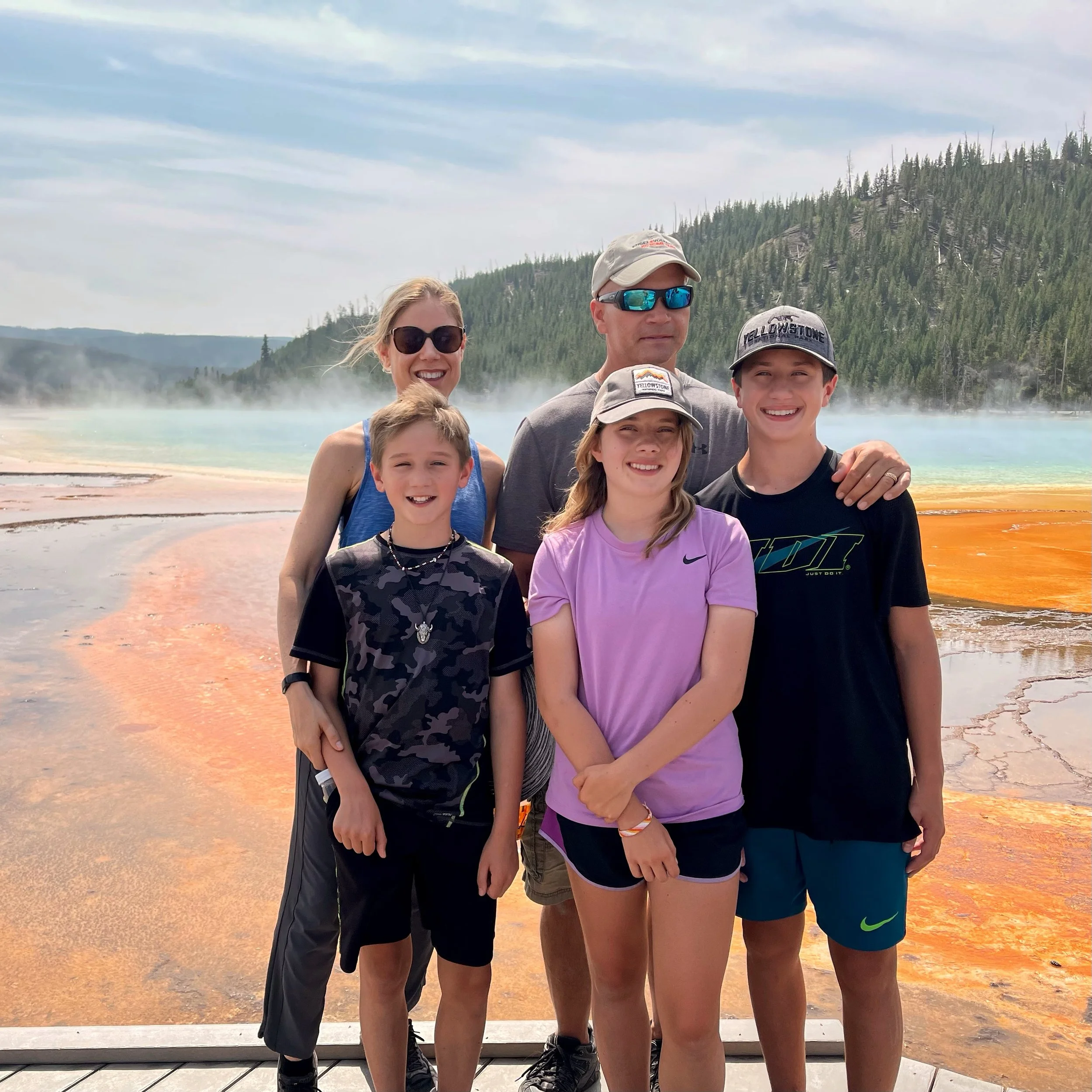 Grand Prismatic doesn’t have much parking, so we went first to beat the crowds, but it is best to view it after Old Faithful. To see the stunning colors, it should be sunny and hot. Because the mornings are chilly, there is too much steam to see the stunning colors. So, we went back later in the afternoon when it warmed up and are so happy we did. It looks exactly like what you see in books.